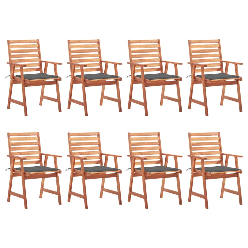Deze moderne houten eetstoelenset met kussens voegt een vleugje natuurlijke stijl toe aan je tuin of terras. Deze houten stoelenset is een perfecte keuze als je buiten wilt eten.