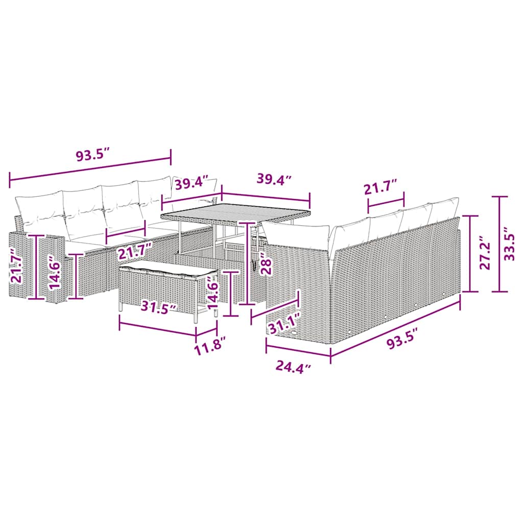 Deze tuin-sofazet met kussens van poly rattan geeft een hele nieuwe look aan je buitenruimte met zijn stijlvolle uiterlijk en handige ontwerp. Het heeft een moderne uitstraling met strakke lijnen en weinig gedoe, waardoor het perfect past in elke tuin of op elk terras. Het is een fijne plek om te socializen of gewoon te ontspannen. Het geweven设计 και trendy kleuren brengen een touch van klasse en combineren comfort met stijl in een uitnodigende maar ook stevige zitplek.