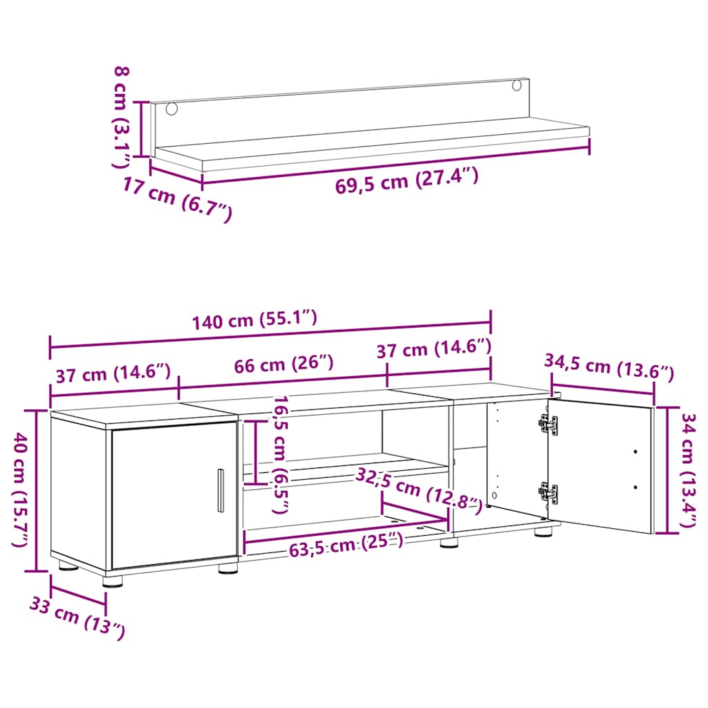 - Algemene afmetingen: 140 x 40 x 33 cm (W x D x H)