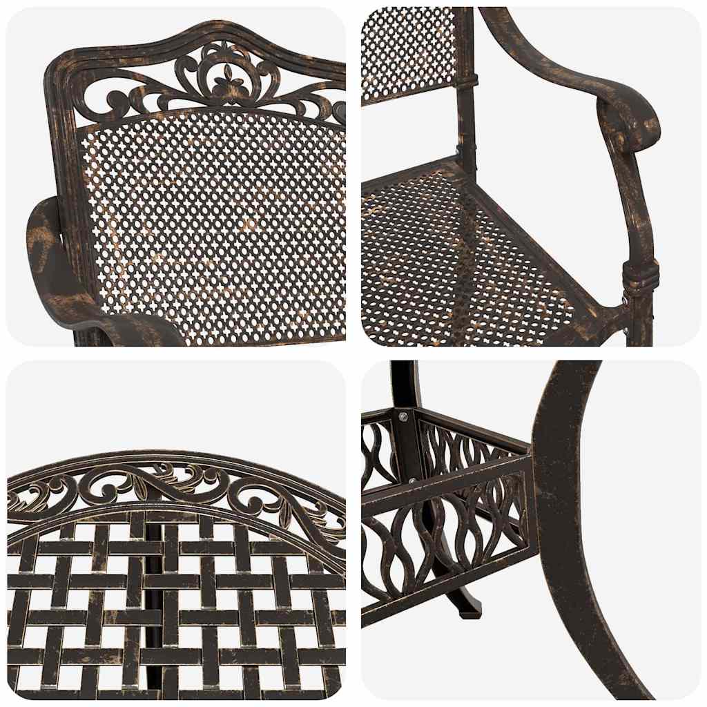 Deze mooie tuinset is gemaakt van sterk gegoten aluminium, wat het een klassieke look geeft die perfect past in je tuin of op je balkon. Het heeft klassieke details die wat verfijning meebrengen, waardoor het een prachtig middelpunt is voor buiten diners en bijeenkomsten in de lente en zomer. Stel je voor dat je gezellige avonden hebt met vrienden en familie, dineren onder de sterren, omringd door deze mooie mix van stijl en praktische gebruik!
