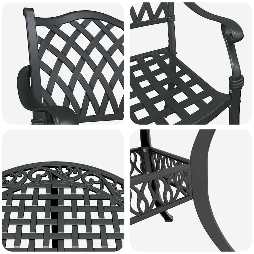 Deze mooie tuinset is gemaakt van sterk gegoten aluminium, wat het een klassieke look geeft die perfect past in je tuin of op je balkon. Het heeft klassieke details die wat verfijning meebrengen, waardoor het een prachtig middelpunt is voor buiten diners en bijeenkomsten in de lente en zomer. Stel je voor dat je gezellige avonden hebt met vrienden en familie, dineren onder de sterren, omringd door deze mooie mix van stijl en praktische gebruik!