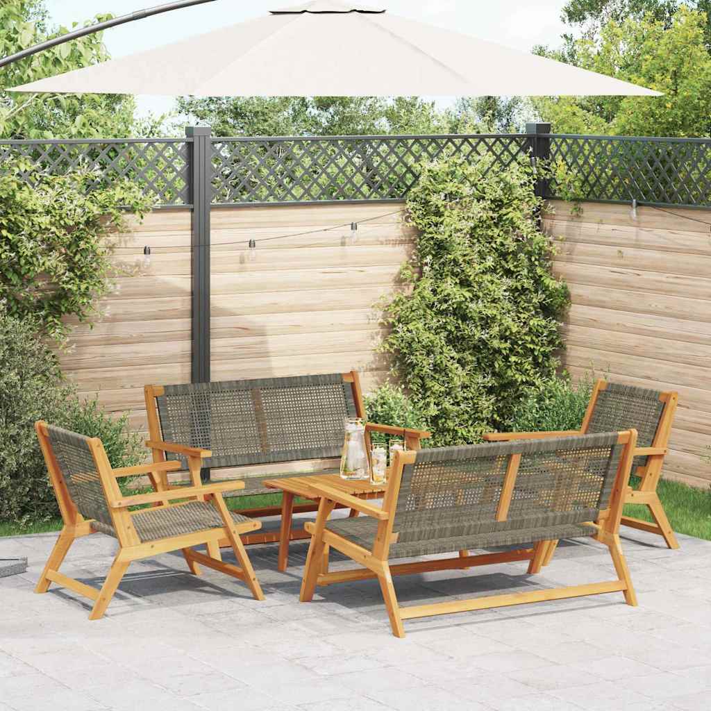 - Duurzaam massief acaciahout: De hele set, inclusief poten, frame en oppervlak, is gemaakt van massief acaciahout, dat bekend staat om zijn stevigheid. Dit betekent dat de meubels het weer kunnen weerstaan zonder hun charme te verliezen.