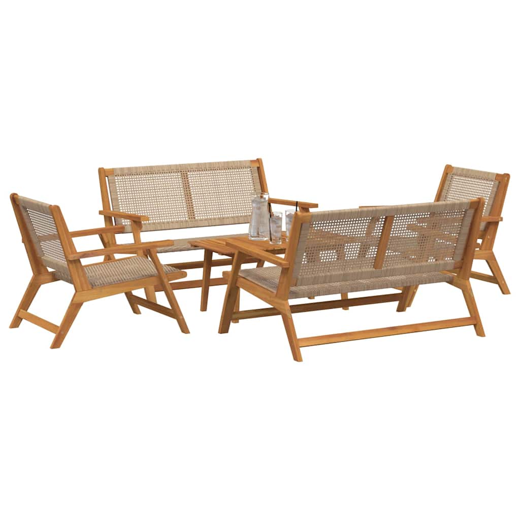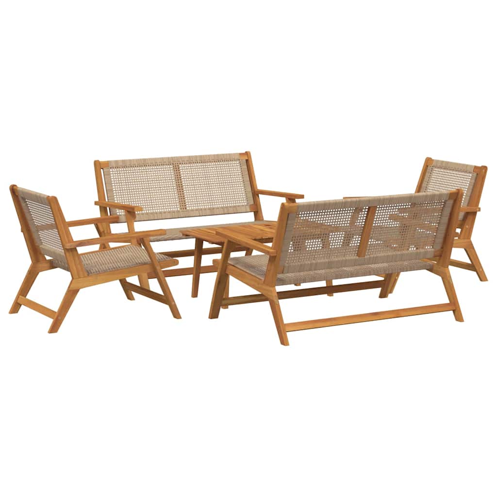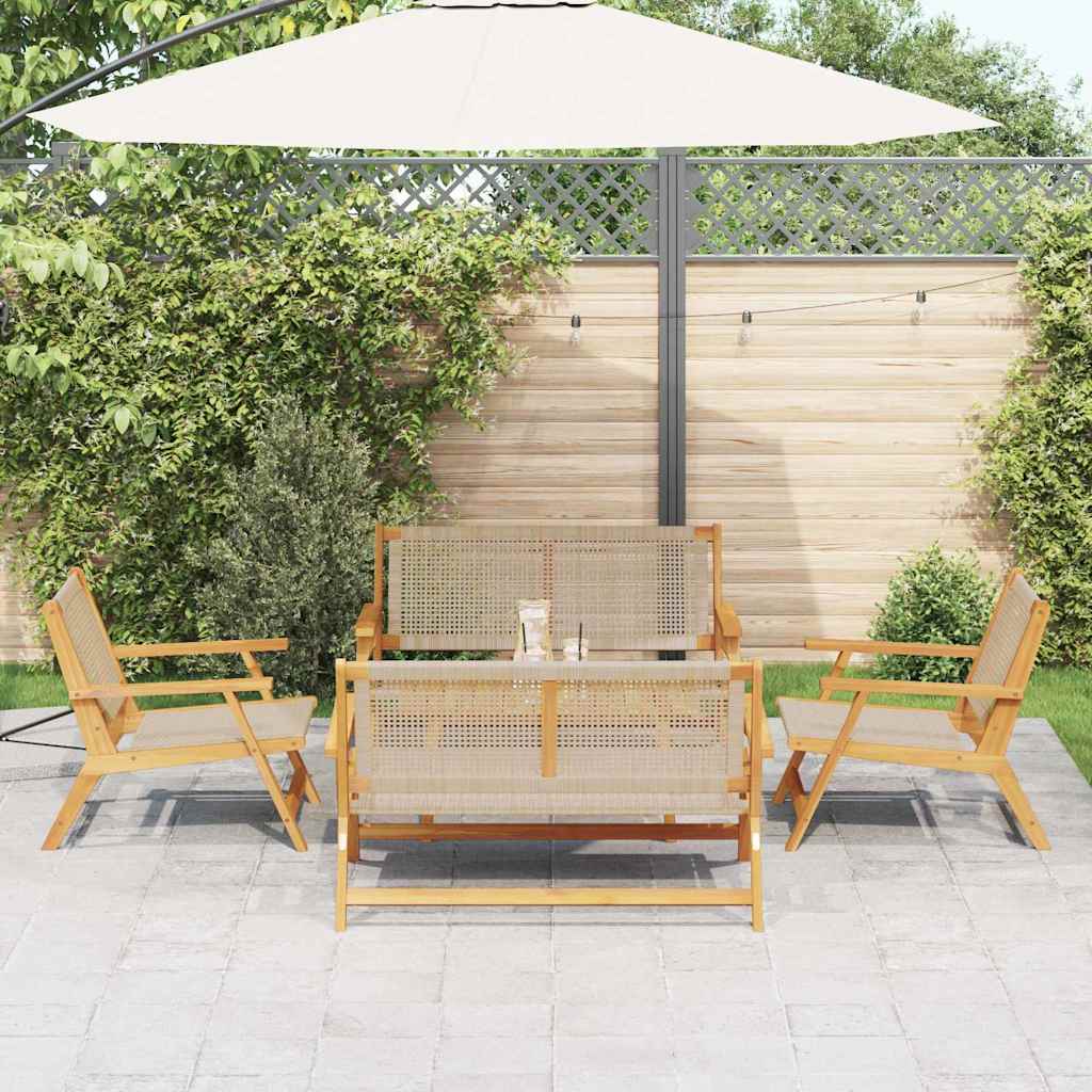 - Duurzaam massief acaciahout: De hele set, inclusief poten, frame en oppervlak, is gemaakt van massief acaciahout, dat bekend staat om zijn stevigheid. Dit betekent dat de meubels het weer kunnen weerstaan zonder hun charme te verliezen.
