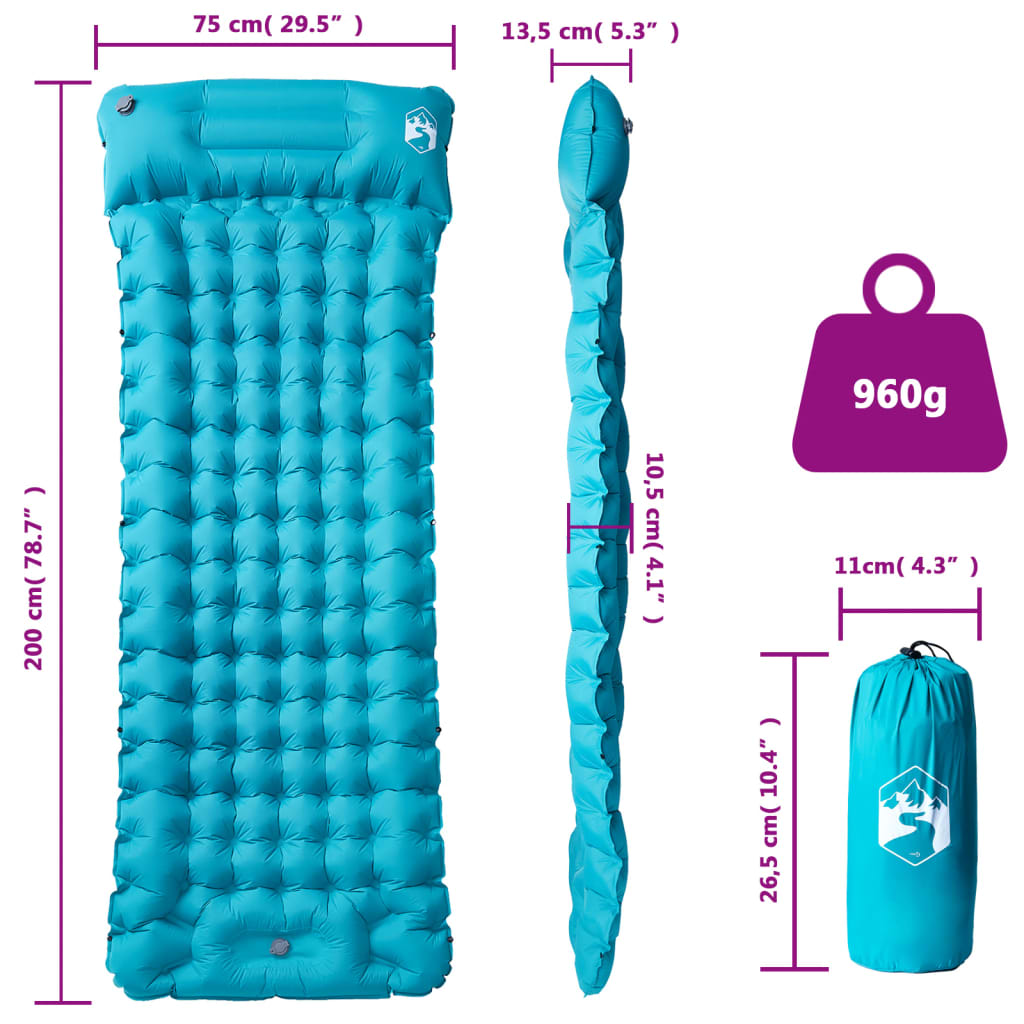 - Comfortabel: de zelfopblazende kampeermat heeft een dikte van 10,5 cm om je te isoleren tegen een koude, vochtige of ongelijke ondergrond. Het heeft ook een geïntegreerd kussen om de nekdruk te verlichten.