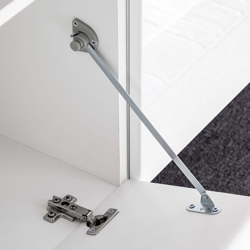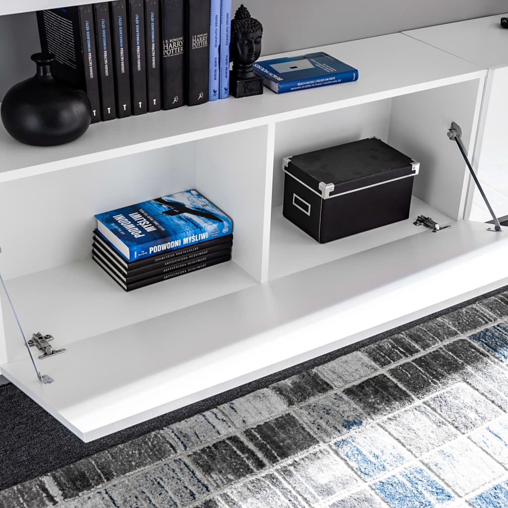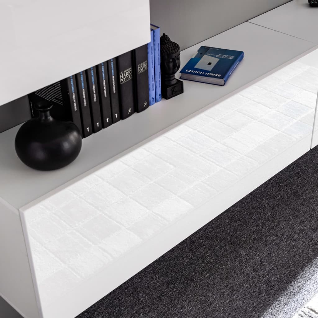 De set, bestaande uit 3 wandkasten, 2 wandplanken en 1 tv-meubel die uit 3 kasten bestaat, biedt voldoende ruimte om je multimedia-apparaten, dvd-speler, mediadragers, boeken en allerlei kleinere voorwerpen op te bergen. Hij is ook ideaal voor het plaatsen van decoratieve objecten, fotolijsten en zelfs potplanten. De glazen schappen hebben energiezuinige LED-verlichting om een aantrekkelijke sfeer te creëren. De tv-kasten hebben valdeurtjes.